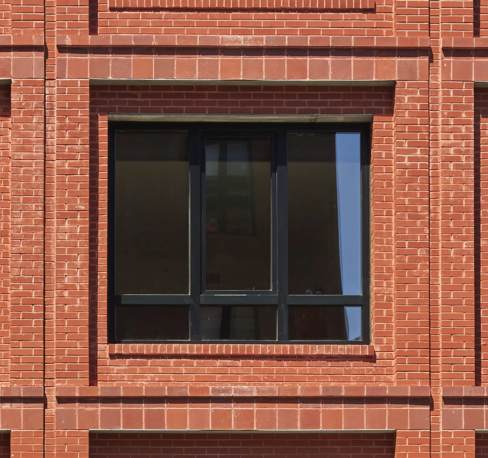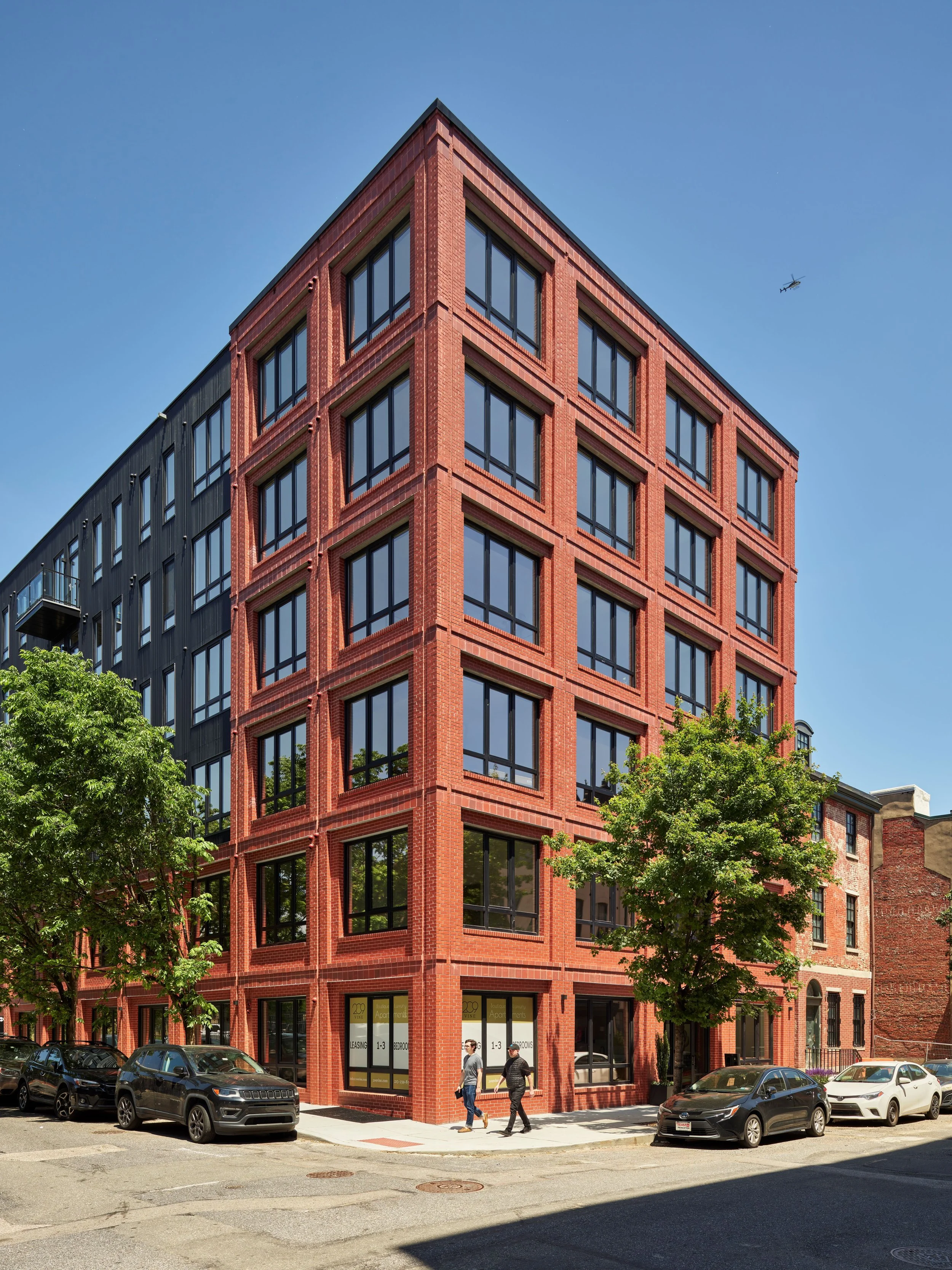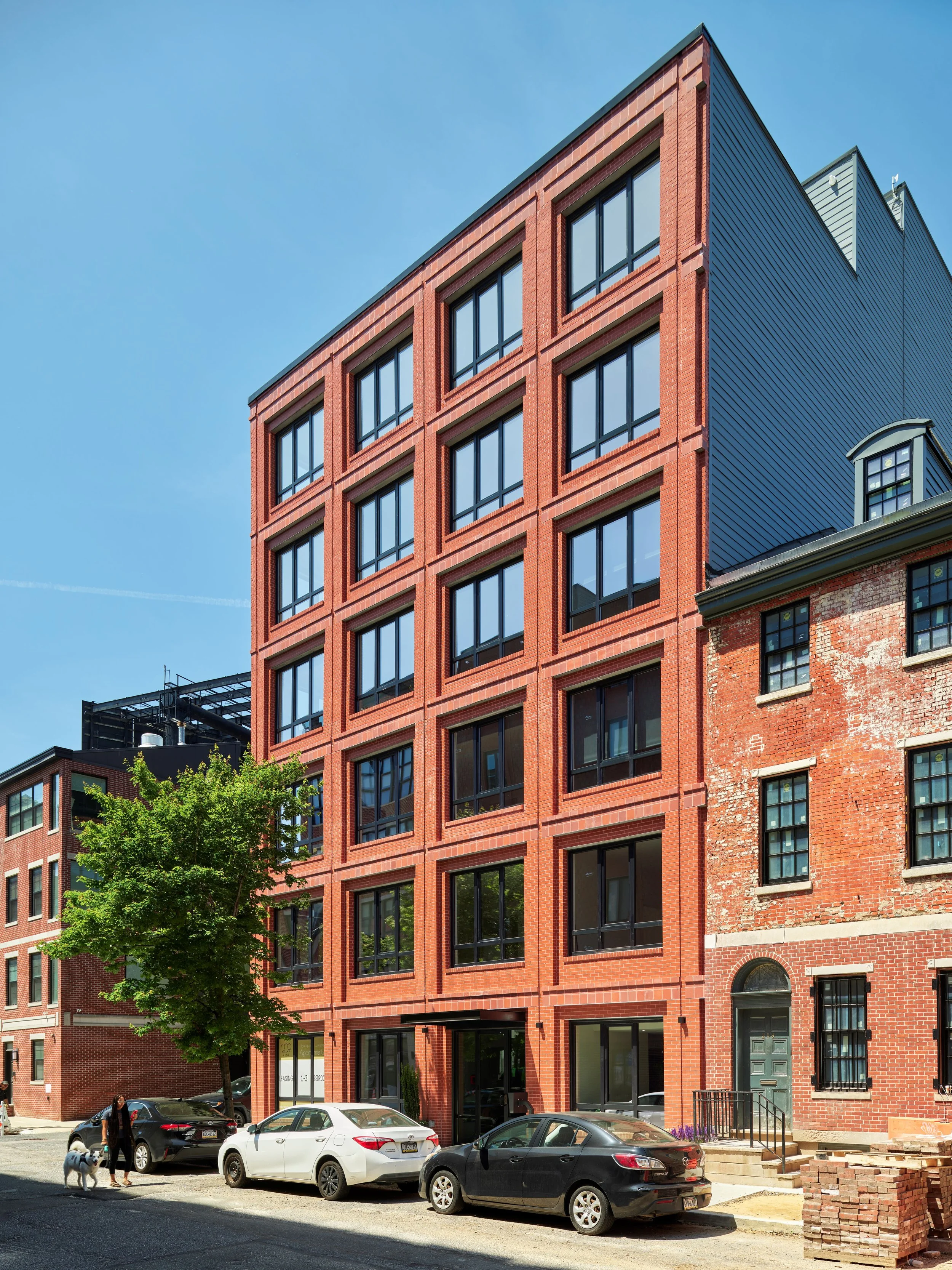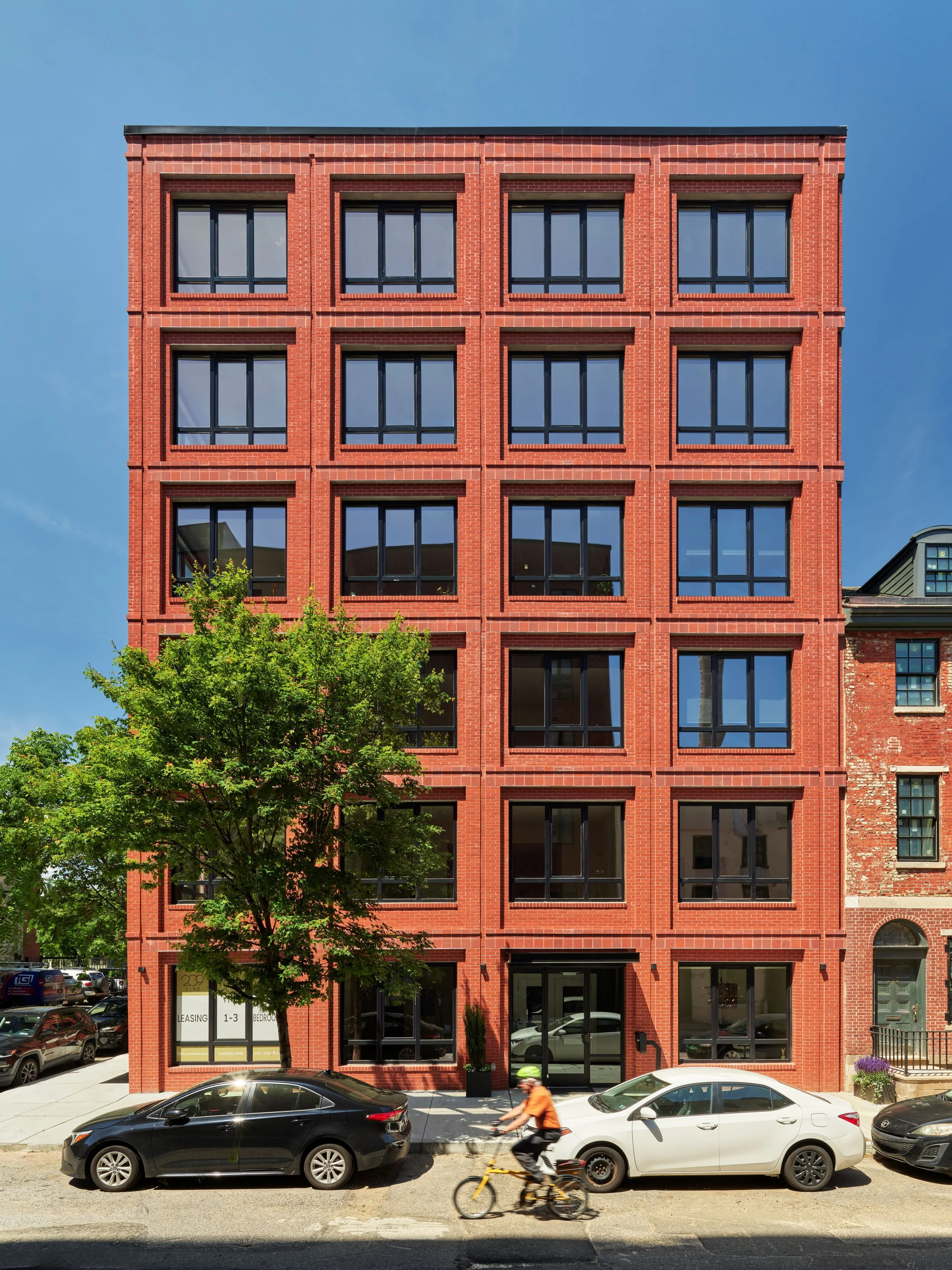 Red brick was the obvious contextual choice in the historic Old City neighborhood of Philadelphia. The large grid formed by the loft-like windows is further defined by a series of projections and reveals that articulate the facade. The use of triple brick along with a standard modular brick adds another layer of scale to the overall composition.